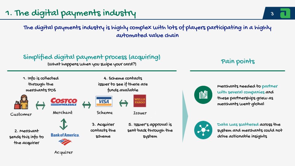 Merchants had to partner with many companies to accept payments and this generated disperse data that drove little actionable insights