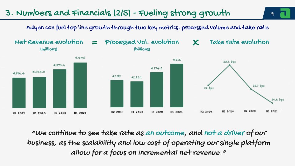 Adyen’s strategy to grow net revenue has clearly been laid out by mgmt., focusing on incremental processed volume at the expense of take rate