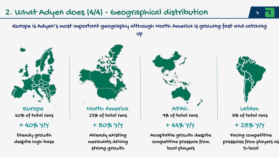 6/ Adyen is dominant in Europe although it’s quickly growing in the US due to its existing customer base giving more domestic volume to the company
