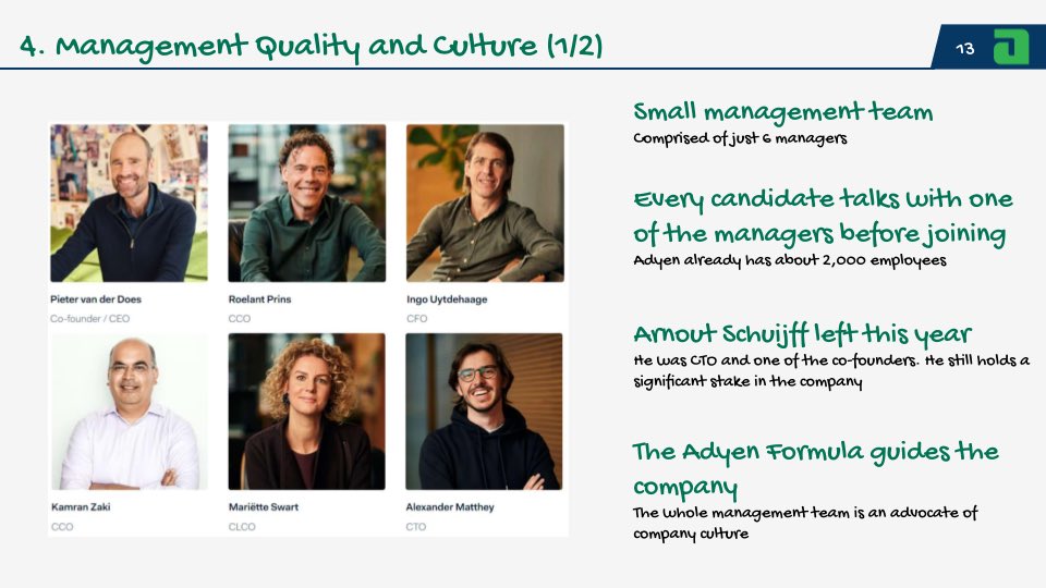 12/ Adyen is managed by a small team of 6 managers.