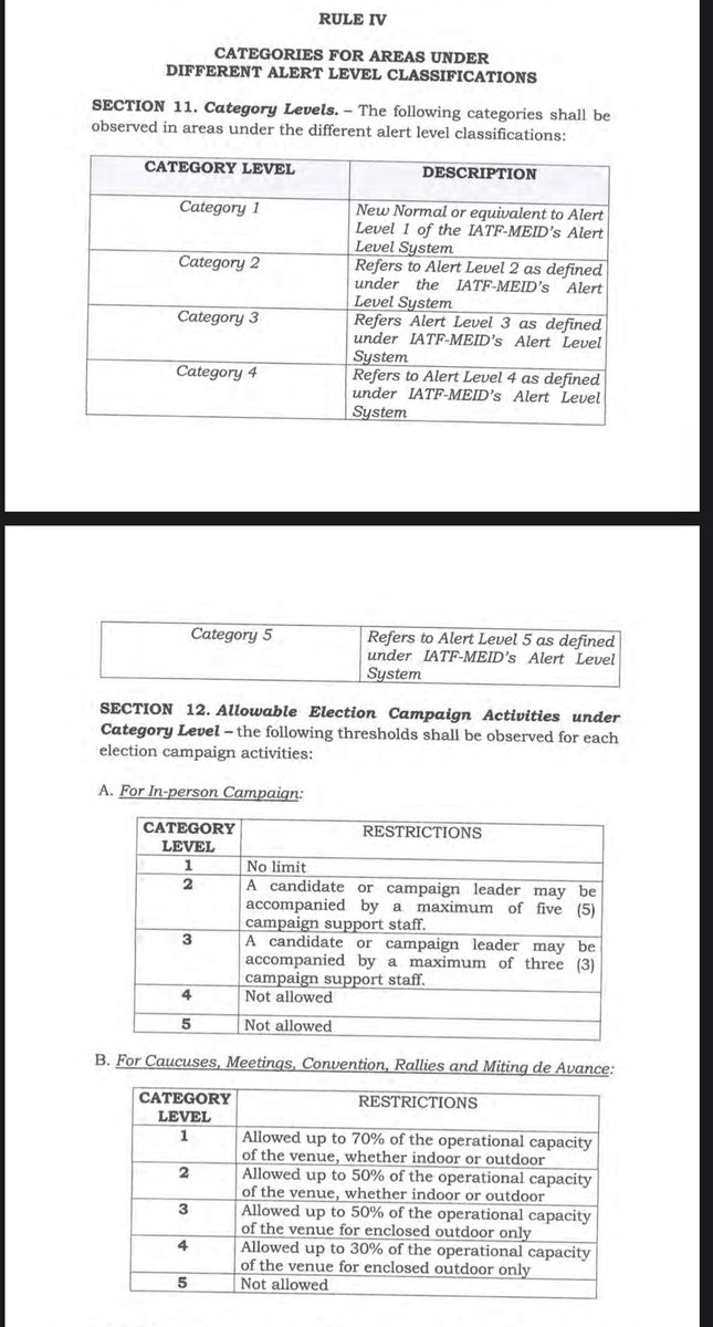 @meltlopez Here are Comelec’s limits for in-person campaigns, political rallies, party caucuses, and motorcades. These are anchored on the alert level per area, as identified by IATF #TheFilipinoVotes | @meltlopez