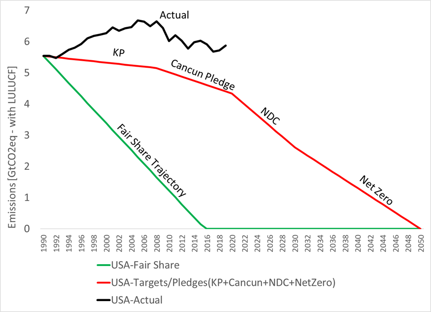 4/n US posturing as climate leader, helped along by positive assessments pre-COP26 by other reports @UNEP Emissions Gap Report, @climateactiontr But what is the reality? US, fair share vs. pledges vs. actual in Figure. 1990 onwards.