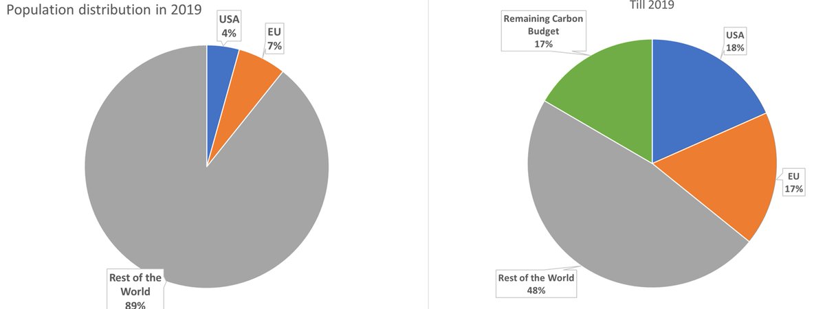 3/n Only 17% of the total budget for even a 50% chance of 1.5 deg. C left. 500 GtCO2 left for the future (~2500 emitted till 2019). US and EU alone (11% of global population) responsible for 43% of emissions till 2019. NDCs imply that they will use 31% of the remaining 500 Gt.