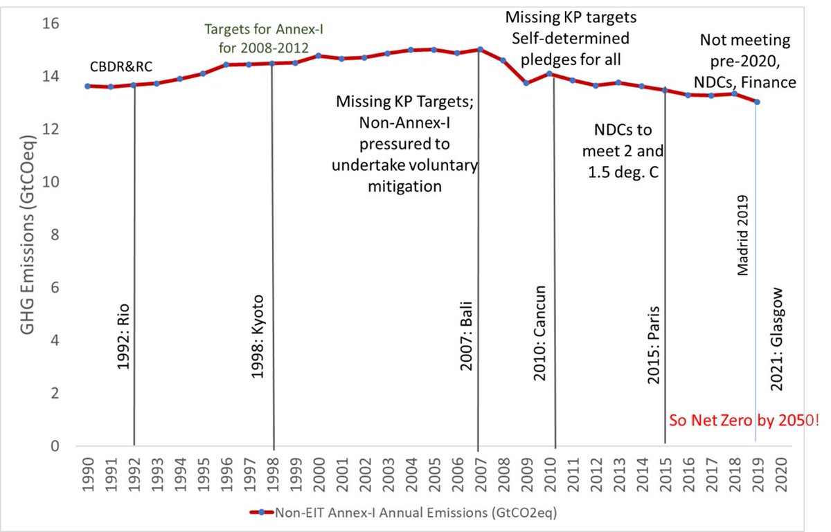 5/n Inaction and constant shifting of goalposts a common element across the richest countries. See emissions chart for non-EIT Annex-I between 1990 and 2019, with shifting of mitigation targets to future