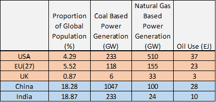 Resource consumption - primary fossil fuel use (coal, oil, natural gas), and electricity use, in absolute and per capita terms. It also shows the number of coal and gas plants currently operating, and in the pipeline, for key countries