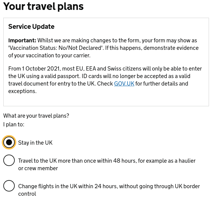 3β£ Next will be 'Your Travel Plans', select 'Stay in the UK' & continue.