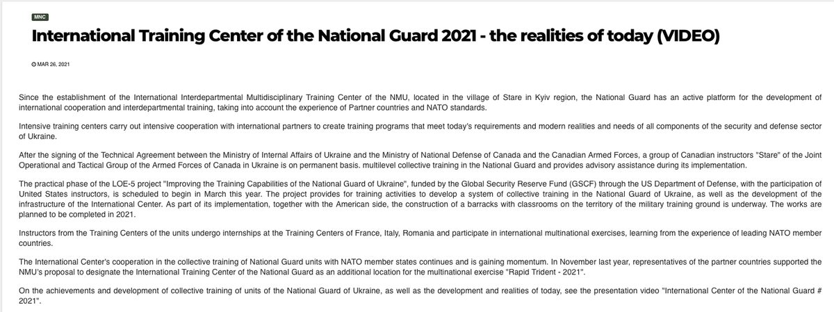 You can read about Canada, U.S., NATO role in the International Interagency Multidisciplinary Training Centre-Stare (Міжнародний центр підготовки підрозділів НГУ) on the NGU's site: ngu.gov.ua/mizhnarodnyj-c…. The NGU Academy gets Western backing too.