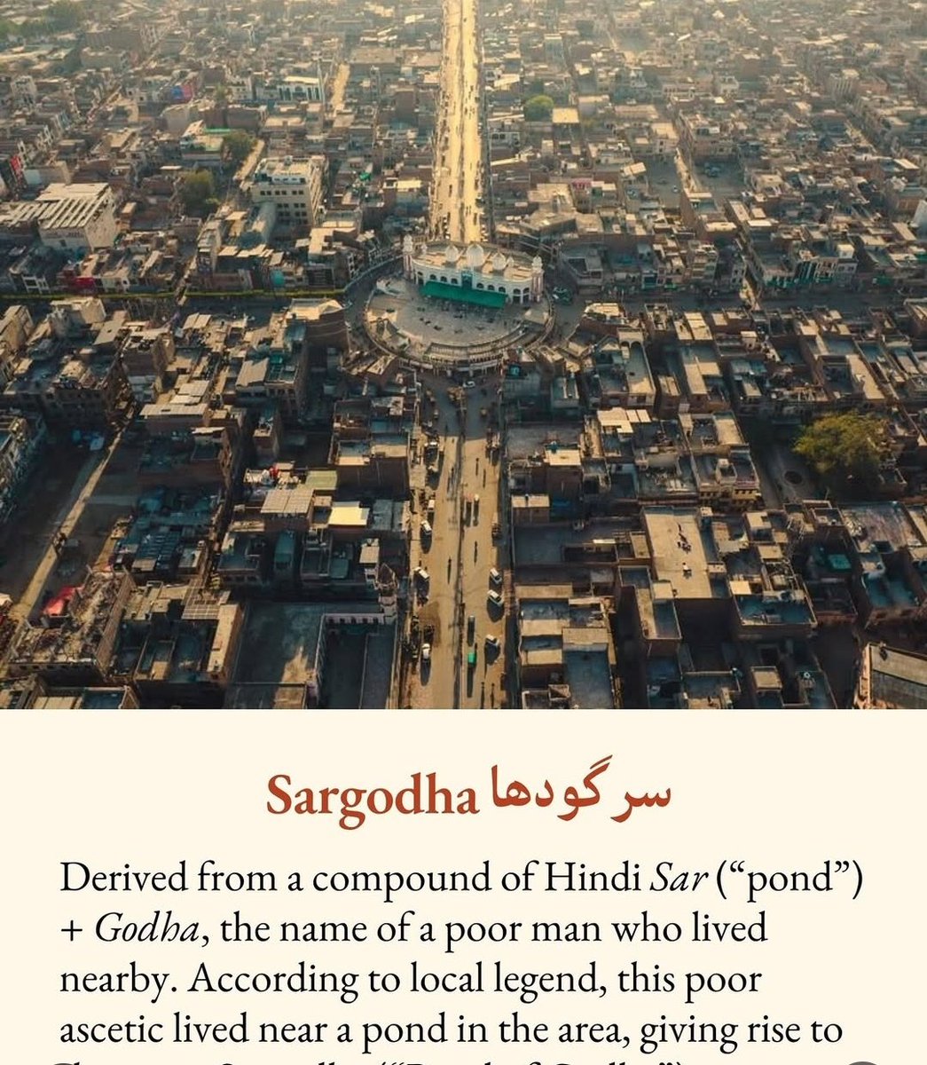 شہرسرگودھا کا قدیم سنسکرتی نام "سورگودھم" (Savergodhama) سےملتاجلتا ھےجس کےمعانی 'حیرت انگیز رہائش" کے ہیں۔