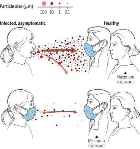Se a pessoa estiver infectada com o coronavírus, ele estará nessas duas espécies de gotículas. Mas como as maiores caem logo, o maior perigo são as menores, que ficam suspensas, mas a máscara filtra.