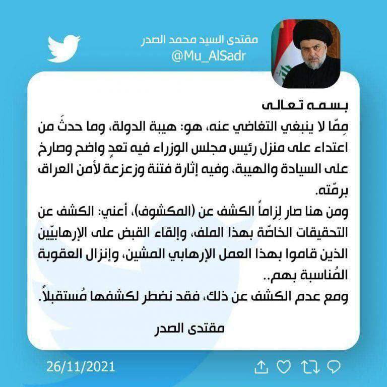 به گزارش آواتودی، مقتدی صدر با انتشار بیانیهای در حساب توییتر نوشت: آنچه که نباید بر آن چشم پوشید، شکوه و هیبت کشور است و حمله به خانه نخستوزیر عراق، تجاوزی آشکار به حاکمیت و هیبت کشور و نیز فتنهانگیزی و ایجاد ناامنی در سراسر عراق است.۲/۴
