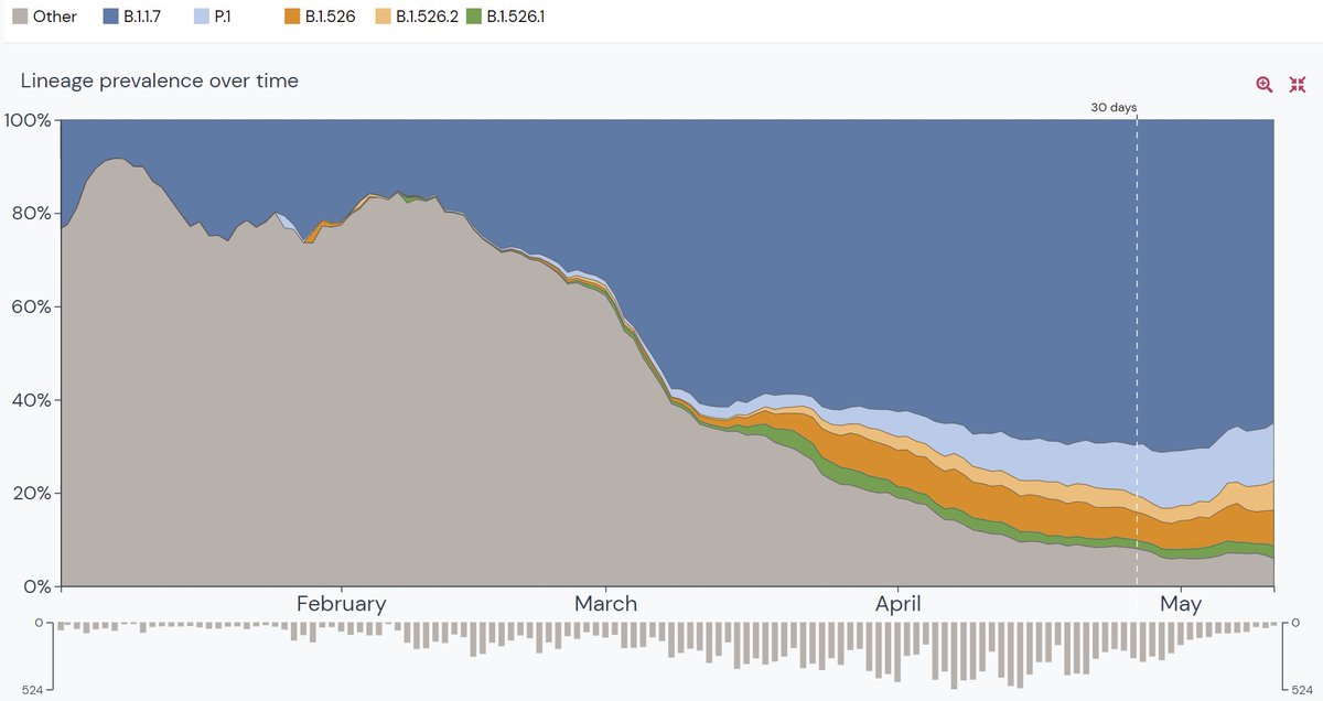 GISAID sequences via fantastic outbreak.info for US as a whole suggest B.1.1.7 now stable @70%, P.1 is growing, B.1.526 frequencies are stable. But variable sequencing means finer resolution is better for understanding frequency dynamics, spatial variability & nuance.