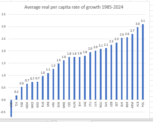 In a dinner conversation w/ a friend, we said, let see in a simplest possible way which countries did well in the transition from socialism to capitalism. I then made this simple calculation: find out the average growth rate of real GDP per capita between 1985 (a "normal" socialist year) and 2024 (the latest available year for all). Here is the graph, with countries ranked in increasing order.