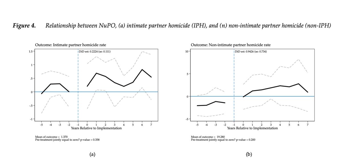 How about domestic homicides? There is some evidence that these rise after passage of a NuPO (panel A). Effects are less clear for other types of homicides (panel B).