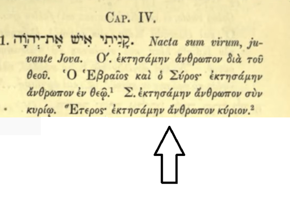 Por lo tanto, si esta lectura es correcta, con ella podemos entender que Eva pensaba que había dado a luz a esa “descendencia” de la que inmediatamente antes se nos habla y que, de alguna forma, pensaba que ese descendiente (Mesías) había de ser de alguna forma Dios.