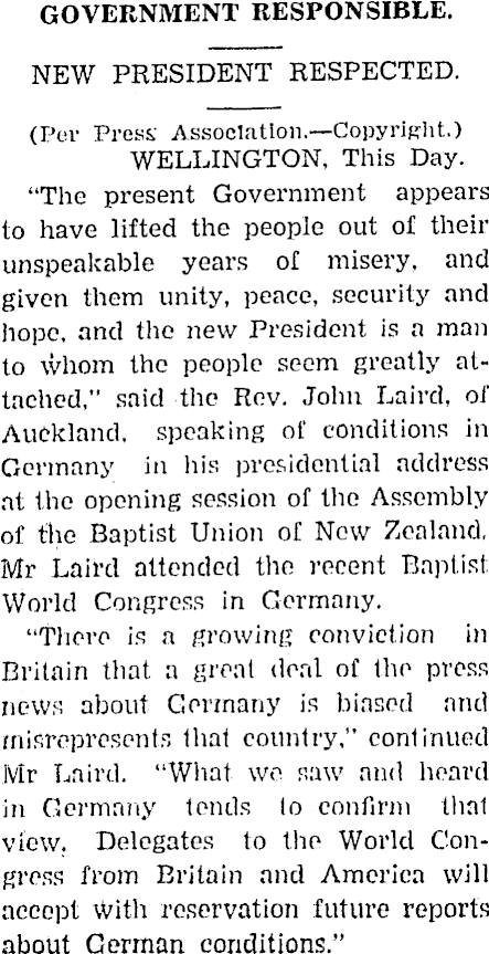 3/4 After Laird returned to his Mt Albert church, he gave a series of talks & interviews in which he promoted Hitler as Germany's saviour. Laird believed Nazi Germany as a land of 'unity, peace & security'. NZ Baptists did not censure Laird - they gave him a platform.