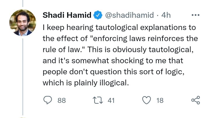 This isn't a tautology, you're just leaving out the part where the legitimacy of law depends on the law being applied equally to all. The fact that Trumpists don't accept that isn't an argument against law, it's an argument against them.