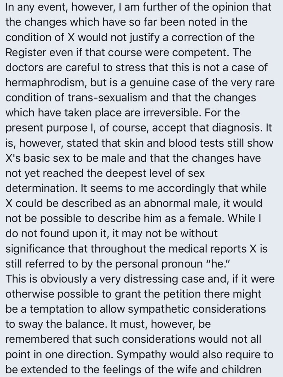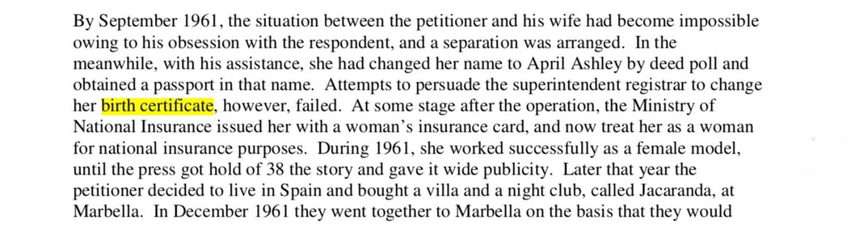 In Corbett, the trans woman, April Ashley lost the case brought by her husband to annul their marriage on the grounds that she was male. Ms Ashley had previously failed, according to the judgment, “to persuade the superintendent registrar to change her birth certificate.” 8.