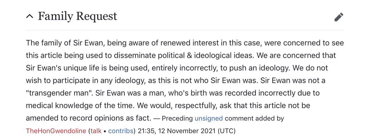 But trans activism has appropriated Ewan Forbes as a trans man, despite the law having said decisively that he was not one, & despite his family’s distress that his life is now being used for ideological reasons. They felt compelled to issue a statement to Wikipedia. 44.