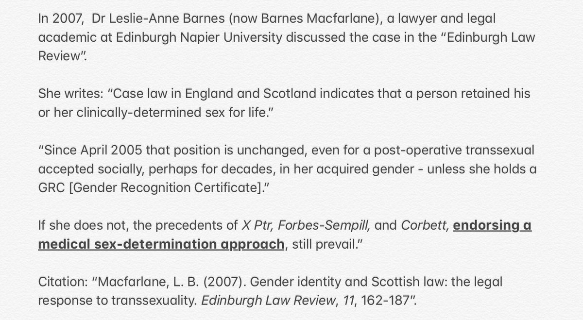 Dr Leslie-Anne Barnes Macfarlane discussed the three cases of X petr, Forbes-Sempill & Corbett in the Edinburgh Law Review. The precedent set by Corbett would be unaffected by consideration of the preceding two cases in “endorsing a medical sex-determination approach”. 43.