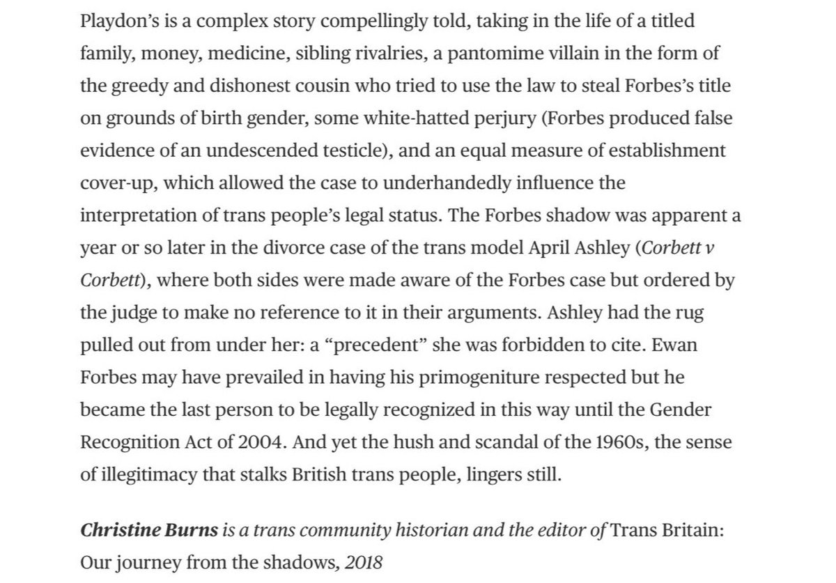 The book also promotes the claim that prior to Corbett, trans people could change their birth certificates. Ms Burns’ review has no literary, historical or legal merit. The lack of relevant disclosure by @TheTLS is scandalous. Why? 50.