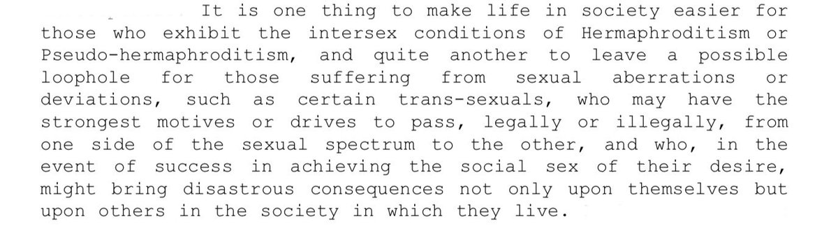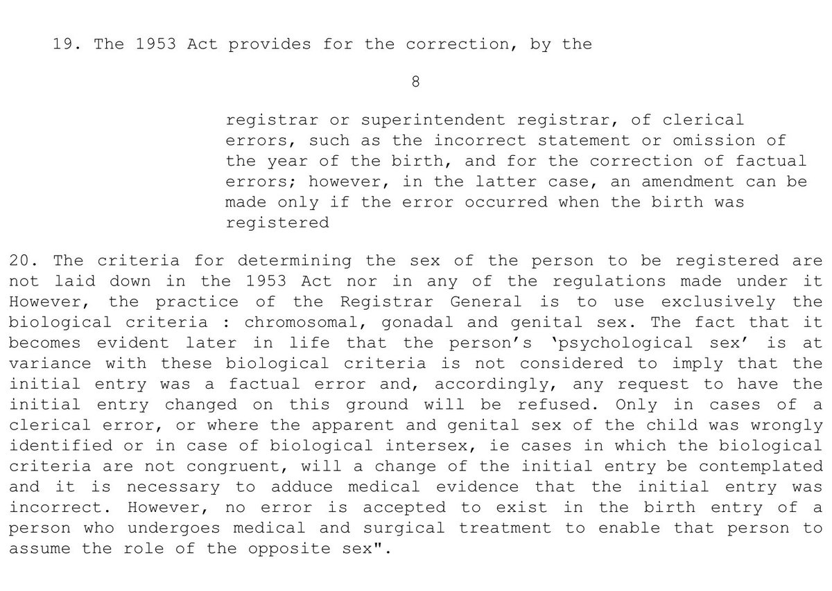 “...no error is accepted to exist in the birth entry of a person who undergoes medical and surgical treatment to enable that person to assume the role of the opposite sex". Note “...the practice of the Registrar General is to use exclusively the biological criteria.” 16.