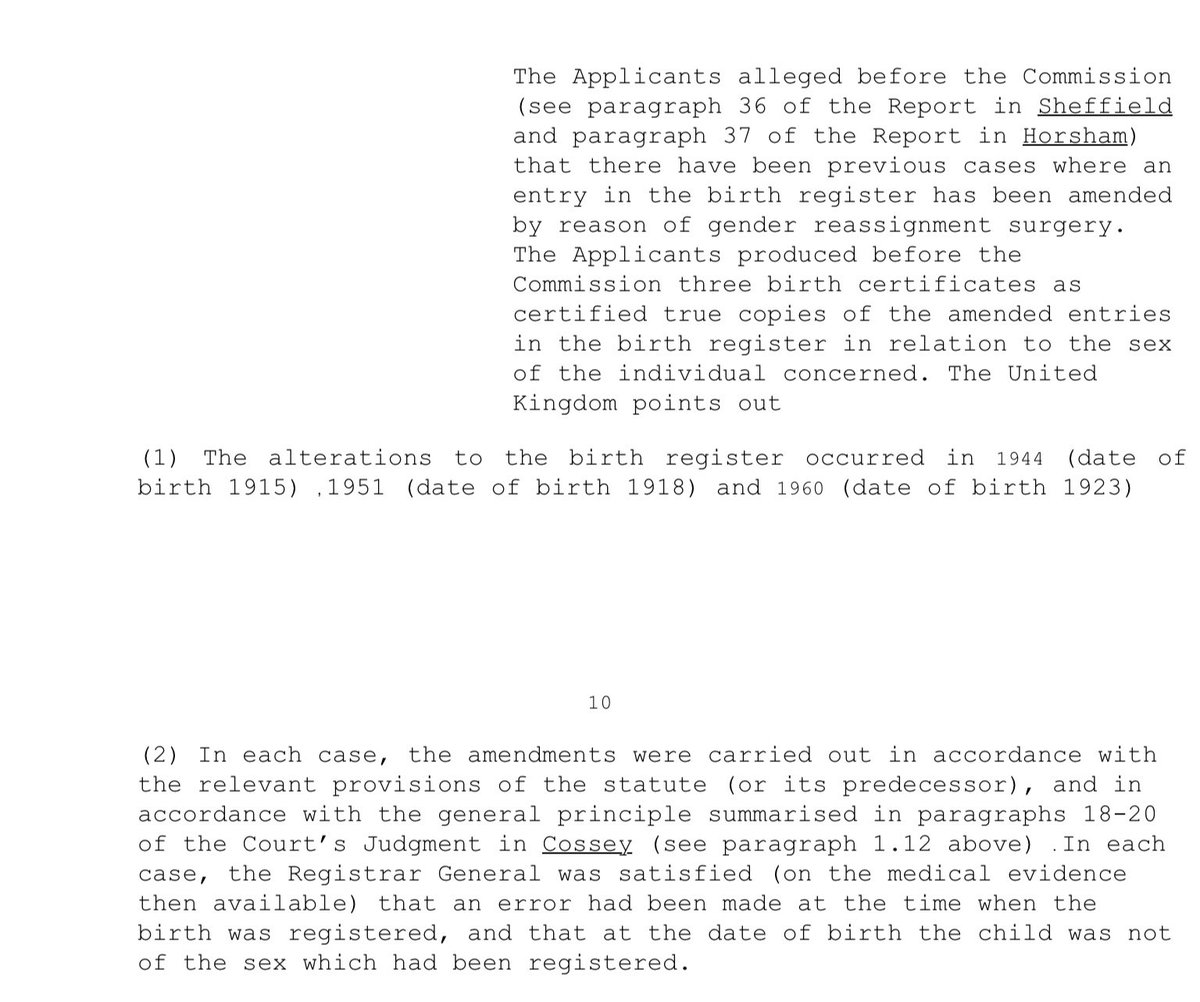 So, it was not, in fact, lawful in England & Wales, prior to the judgment in Corbett, for trans people, pre or post operatively, to change their birth certificates. Corbett didn’t change law in this regard. It was already law. 21.
