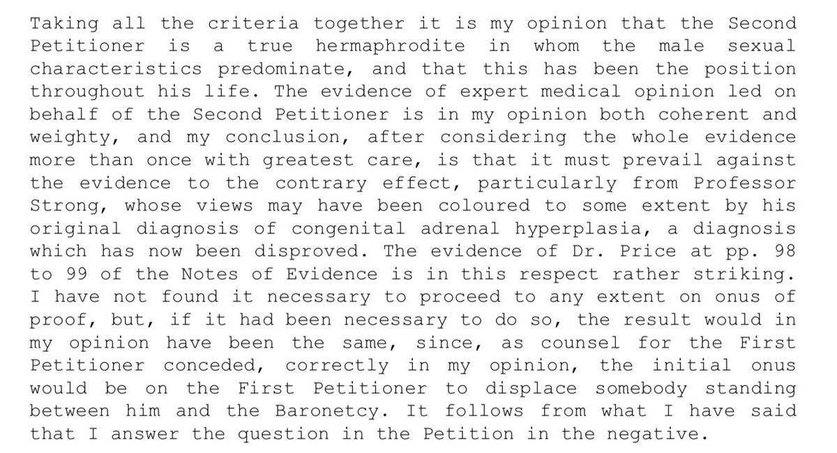 He finds then, that Ewan Forbes-Sempill is, to use the term referenced in the government’s submissions in Horsham, “biologically intersex”. And that he was always male, as an historical fact. Note Hunter’s contextual reference to “a spectrum” as an account of hermaphroditism. 32.