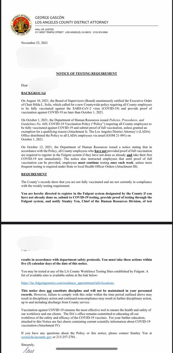 I’m told some L.A. County departments have already started registering with Fulgent. An employee in the D.A.’s office sent me this letter showing he has already been threatened with disciplinary action & termination for failing to register his information with Fulgent. @FoxNews