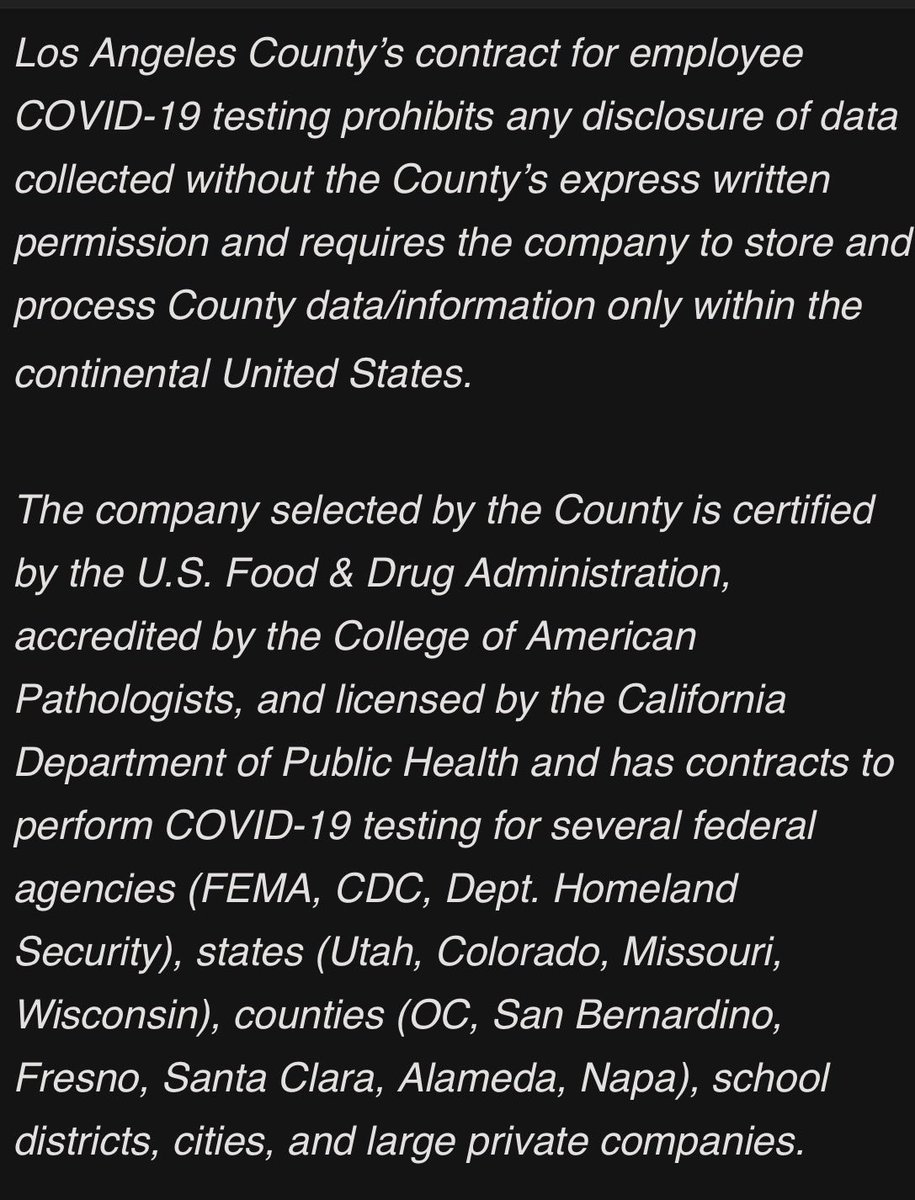 NEW: The L.A. County Sheriff has notified L.A. County that LASD will not work w/ a genetics firm the County hired for mandatory COVID-19 testing/registration of County employees after he received a recent briefing from the FBI warning him about the firm’s links to China. @FoxNews