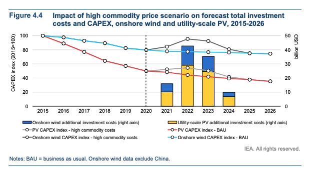 Moreover, the IEA points to risks from current high commodity prices, which would erase some – though by no means all – of the recent wind and solar cost reductions, if they are sustained