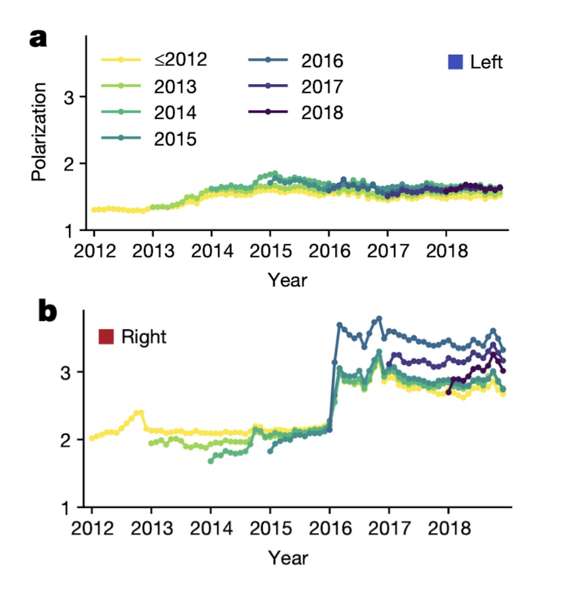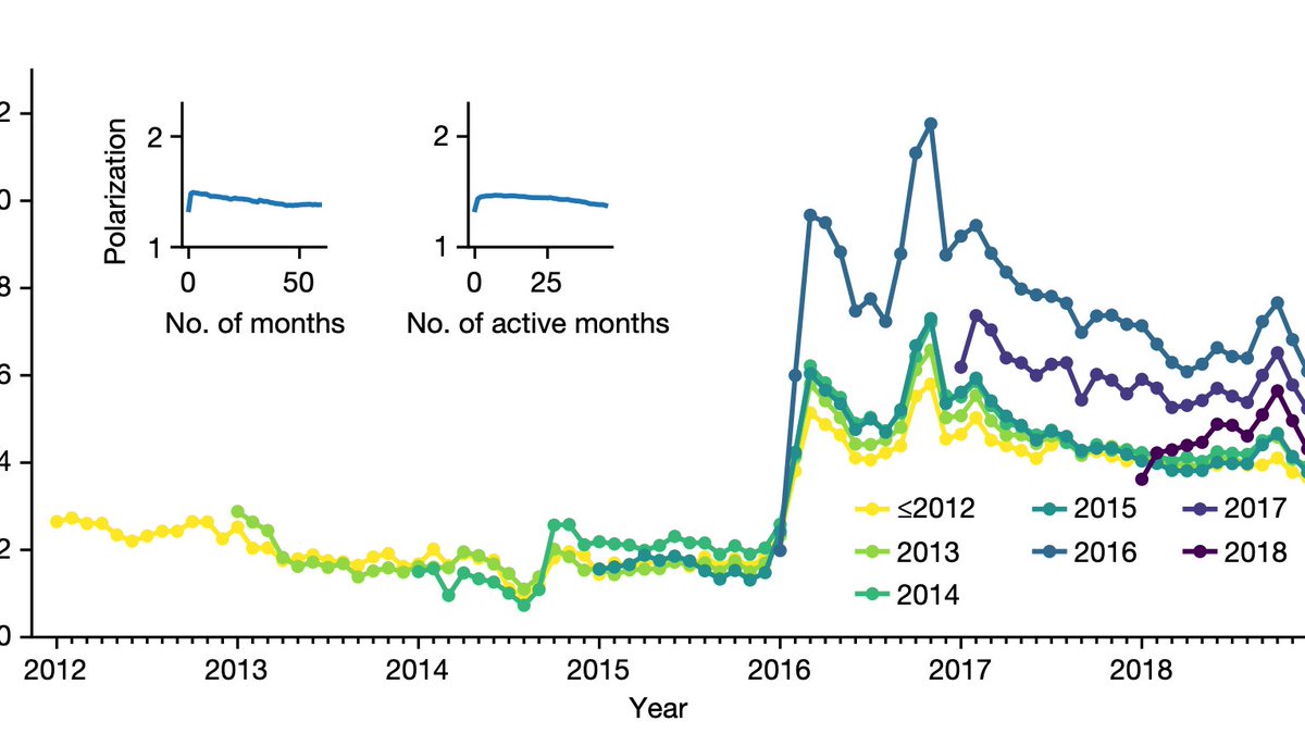 3) The intense increase in polarization in 2016 was disproportionately driven by new (and newly political) users. The 2016 cohort was by far the most polarized group. 4) Individual polarization level is unrelated to previous activity on the platform.