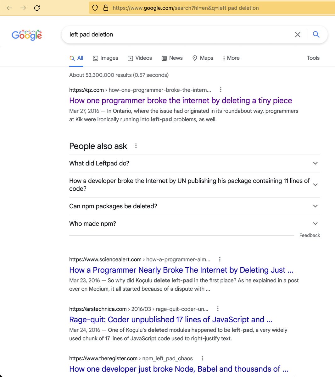 известный случай в JS комьюнити — удаление библиотеки left-pad из NPM Registry
