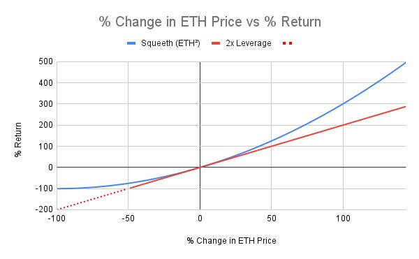 Squeeth is perpetual exposure to ETH² rather than ETH (e.g. if the price of ETH 5x, Squeeth will 25x)