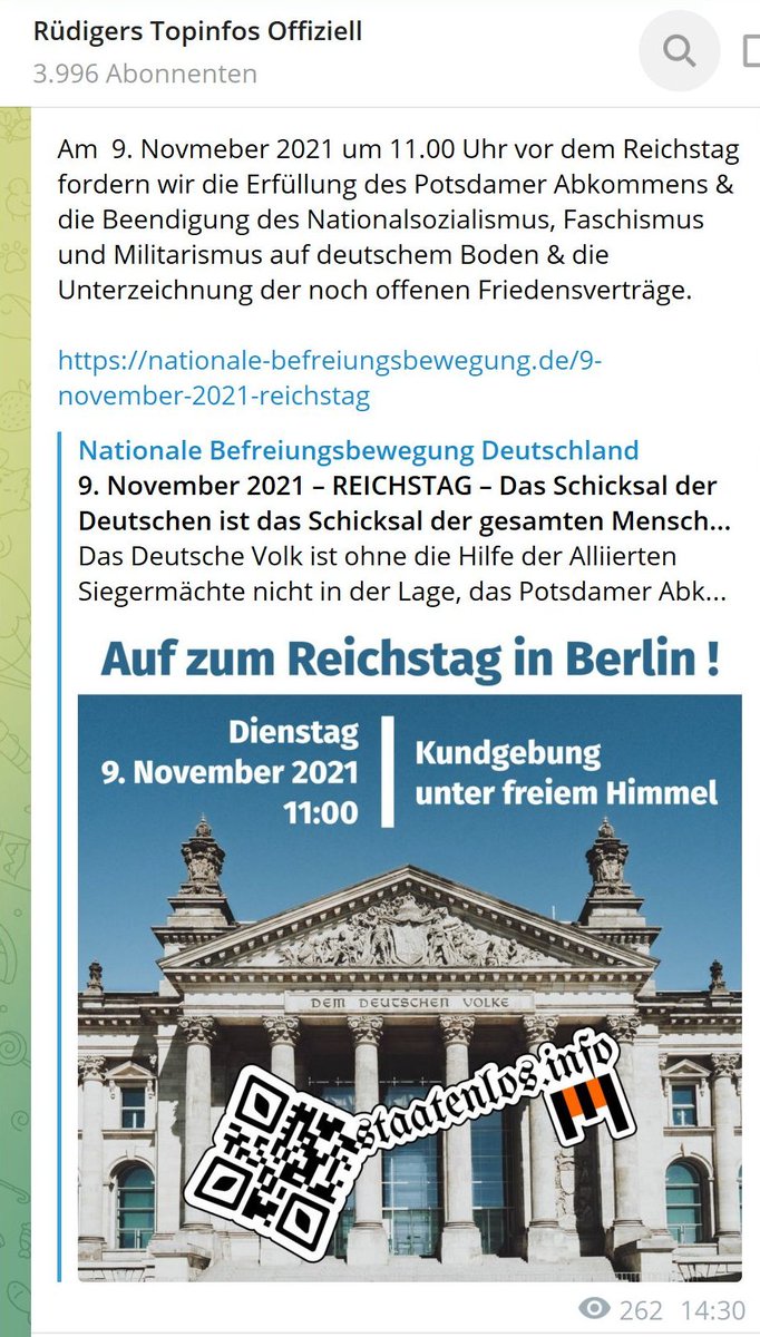 der sich derzeit für die DEU-NOD-Bewegung hält, mobilisiert immer wieder für seine nächste Veranstaltung am 09.11.2021, dem "deutschen Schicksalstag" und dem Tag, an dessen Abend 1938 die vom NS gesteuerten Pogrome gegen das Judentum einsetzten