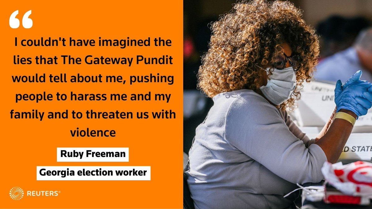A defamation suit against The Gateway Pundit was filed Thursday by Wandrea “Shaye” Moss, a voter registration officer in the Fulton County elections office, and her mother, Ruby Freeman, who was a temp worker for the 2020 election reut.rs/3deuOcq 1/4