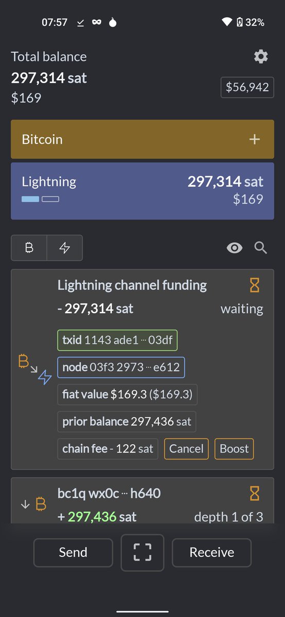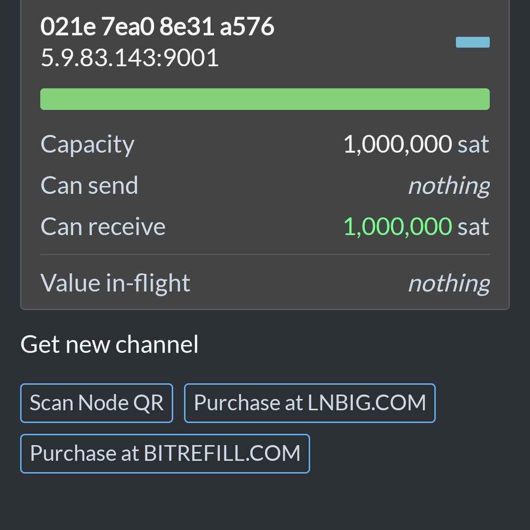 4/8 As soon as the wallet sees the on-chain transaction (can still be unconfirmed), you can open your non-custodial channel to the zero fee routing node by clicking "lightning" and "scan node QR"