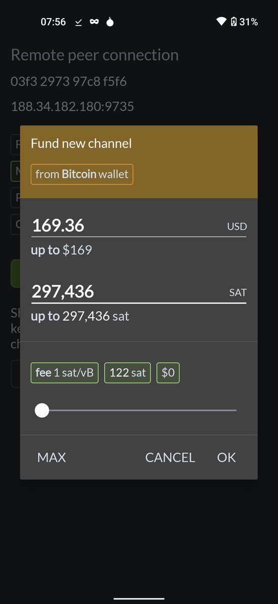6/8 Next you can set the size of the channel. The wallet allows you to use up all your on chain funds by clicking "max". Make sure to set 1 sat/vB fees first. Confirm in the next screen. The transaction will show up in the wallet right away.
