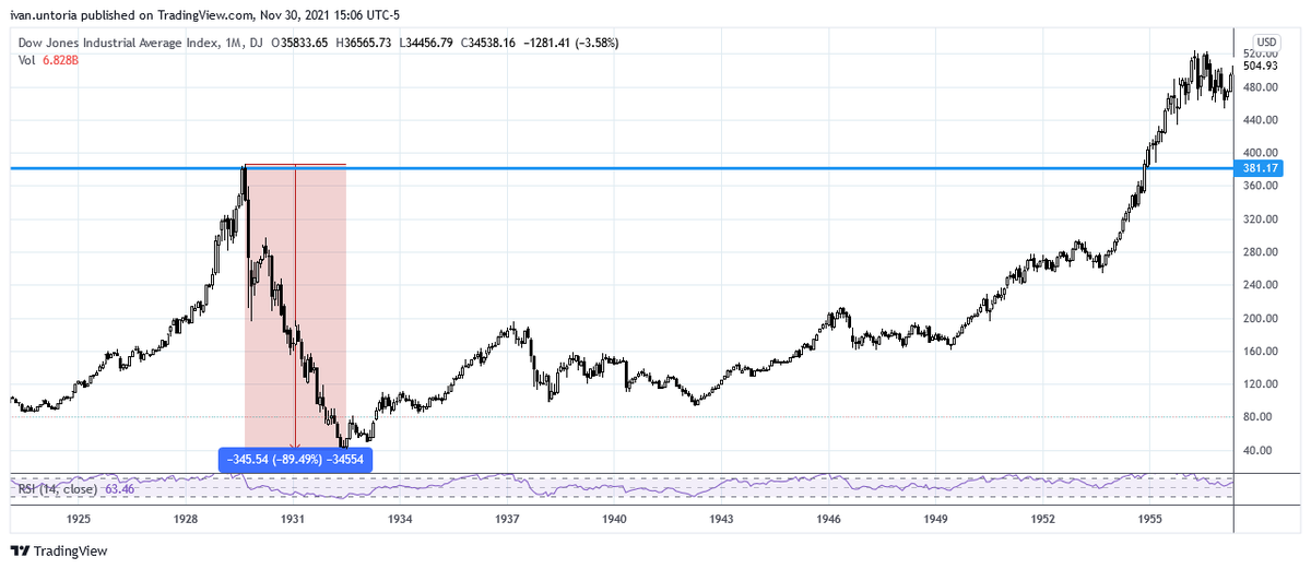El índice estuvo cayendo desde 1929 hasta 1932 pero no recupero niveles previos al inicio de la caída hasta 1954.