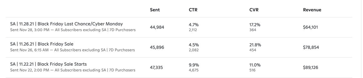 After sending to our BFCM segments, we sent the same campaign to an audience that was unengaged for the last 180 days, but active between 181-365 days ago to re-engage them. Happy w/results for an unengaged audience