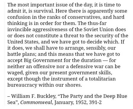 The GOP has for a long time been the party of "big government" precisely for this reason: at pivotal moments, it has either led or helped grow the size of the regime. Bill Buckley himself rationalized a "totalitarian bureaucracy" three years before founding National Review