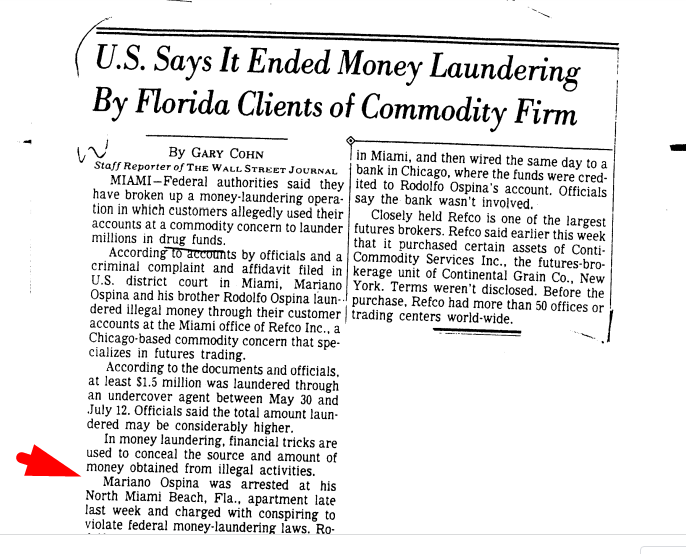 Por otra parte Mariano Ospina Baraya fue detenido en Miami el 6 de septiembre de 1984, en la operación "Green Back" contra el blanqueo de capitales del narcotráfico. Al ser detenido en Miami. Ospina invocó en su favor ser nieto del ex presidente colombiano Mariano Ospina Pérez.