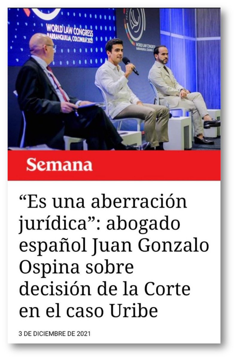 Juan Gonzalo Ospina Serrano se atrevía a defender al ex presidente colombiano Álvaro Uribe Veléz, calificando su proceso de aberración jurídica. No es de extrañar que, al día siguiente, Juango recibiera de manos de Iván Duque la Medalla de Honor que concede el WJA.