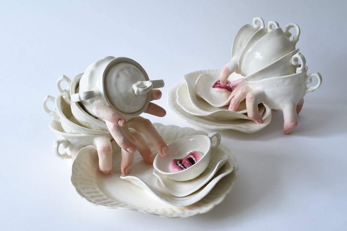 Mas aí se você olha pra uma peça do Ronit Baranga, que deve ser tão desconfortável para usar quanto uma caneca bizarra dessas lojinhas, e não pensa muito sobre isso. A diferença é que essas formas existem em outro contexto, e a gente percebe essa mudança naturalmente.