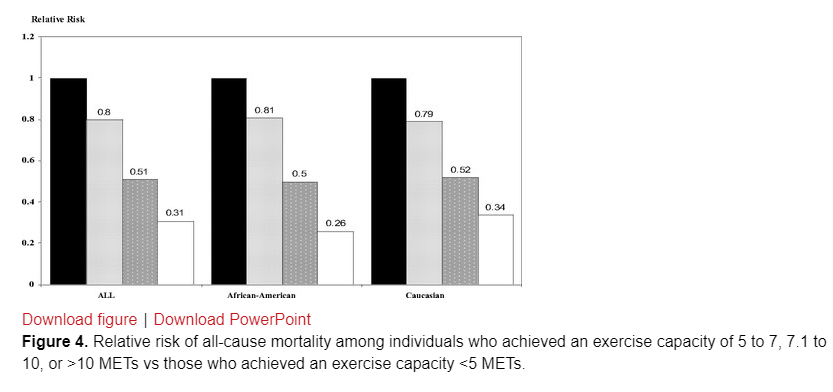 Exercise capacity is a strong, inverse predictor of all-cause death rates. Men in the highest quartile (fourth) of exercise capacity had from 1/4 to 1/3 lower risk of dying during several years follow-up.