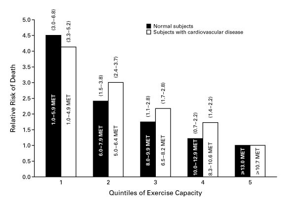 Among men referred for exercise testing, those in the lowest quintile (fifth) of exercise capacity had 4.5 times the risk of dying during 6 years of follow-up.