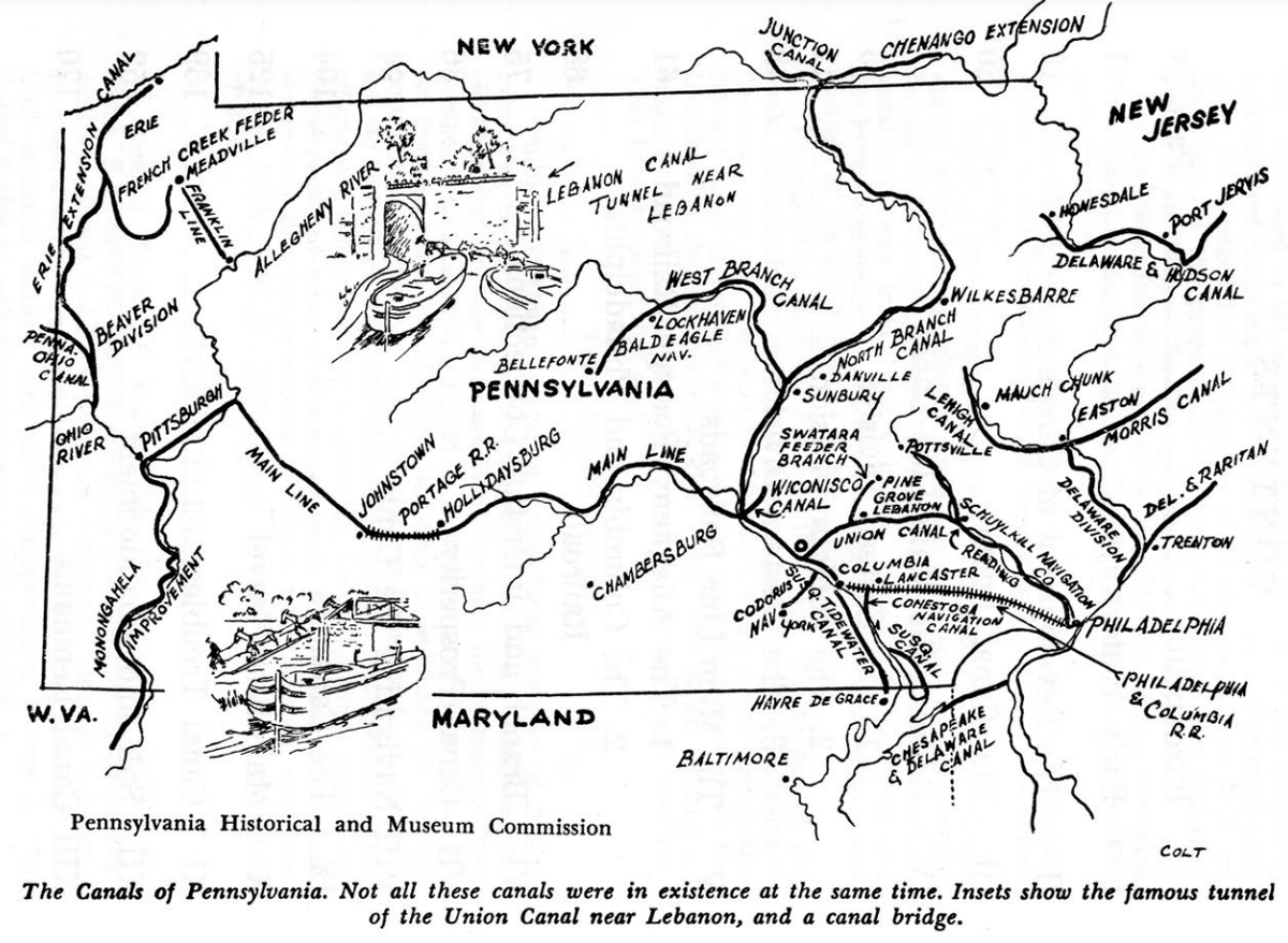 Like with the Erie Canal, the PA Canal (and its branch canals) was surpassed by a railroad roughly along the same route (with some separate tunnels to cross the mountains). What made canals so important was not just the speed of inland shipping. It was the growth of canal towns.