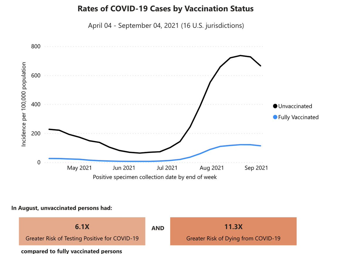 Look at the blue line above. It stays far below the black line. Relative VE is still very strong! But note that blue line jumps from 8.47 weekly cases per 100k in June (pre-Delta) to 121.4 per 100k in late August (peak Delta wave). That's a 13X jump in ABSOLUTE risk for vaxxed.