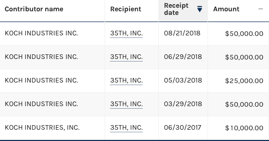 Despite Manchin’s commitment to working across the aisle, Koch Industries poured $185K into a super PAC backing his opponent in 2018