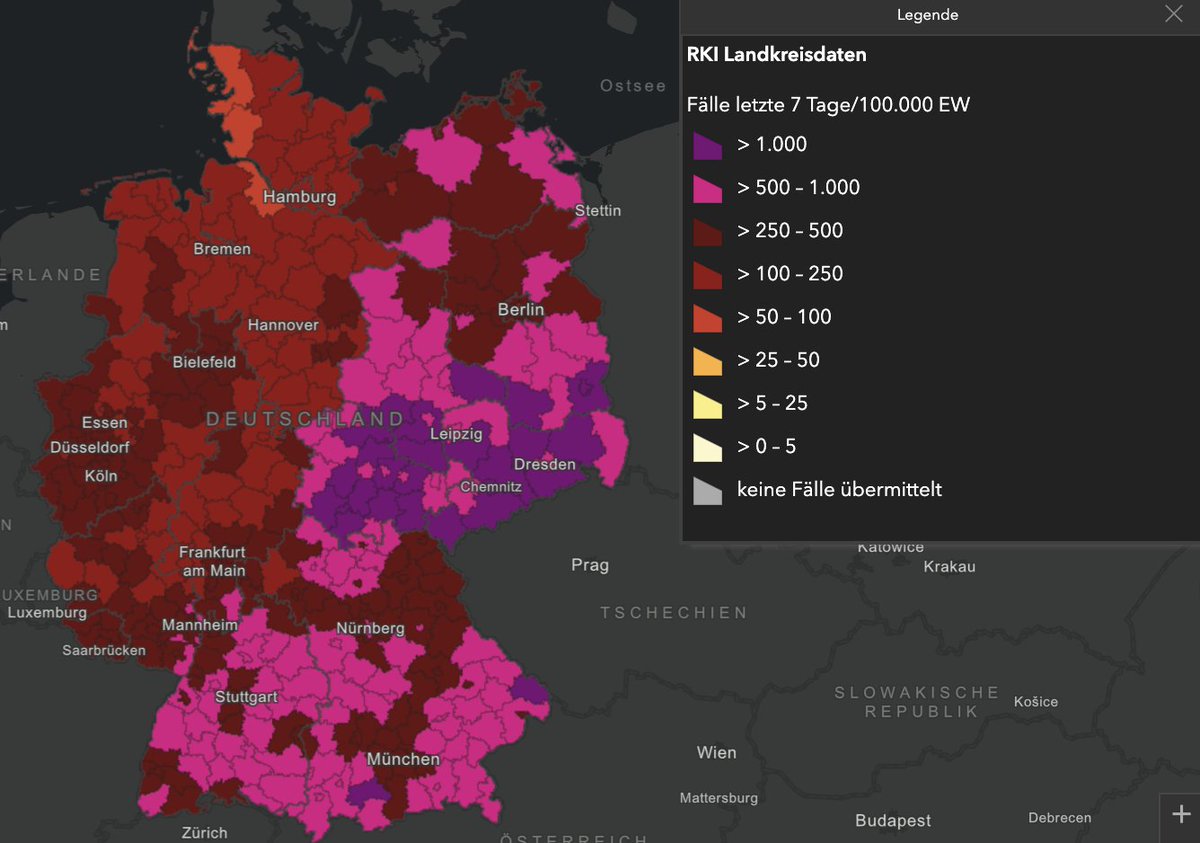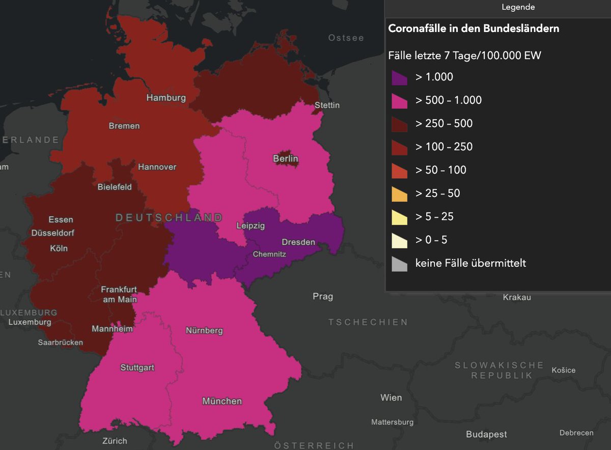 Anstiege gibt es in Bremen, NRW, Mecklenburg-Vorpommern, Schleswig-Holstein. Das markanteste Plus verzeichnet Sachsen-Anhalt, wo die Inzidenz von 861 auf 908 steigt.