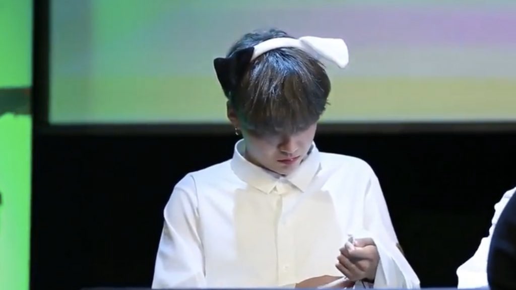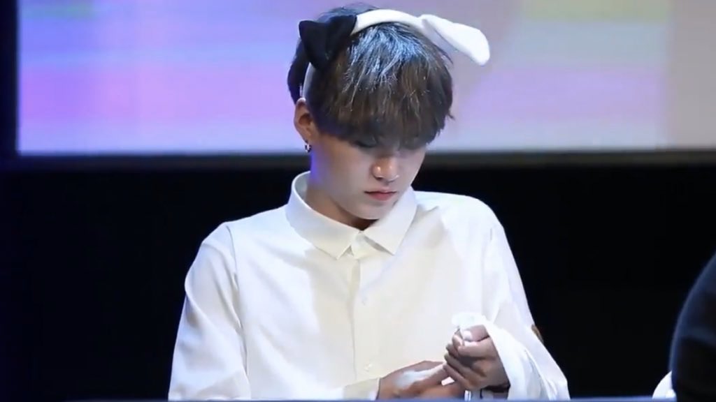 jungkook with his tiny ponytail he is looking so tiny in that :(